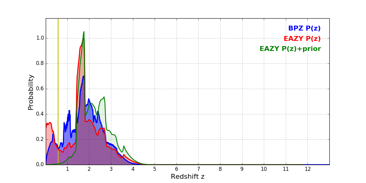 In P(z) plots: Yellow lines mark the cluster redshift z = 0.566,