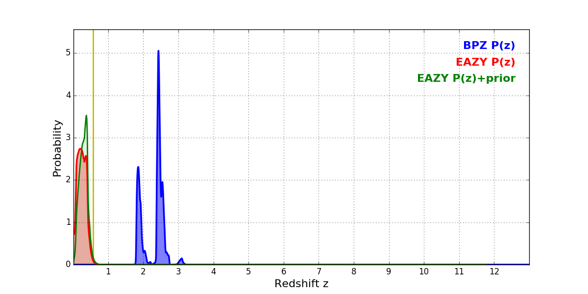 In P(z) plots: Yellow lines mark the cluster redshift z = 0.566,