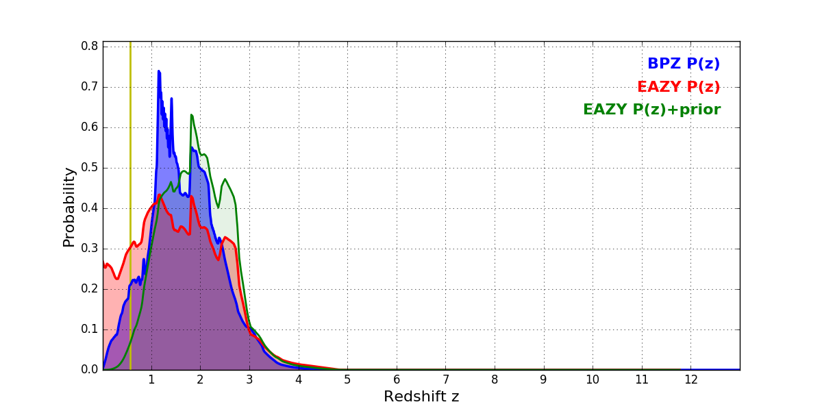 In P(z) plots: Yellow lines mark the cluster redshift z = 0.566,