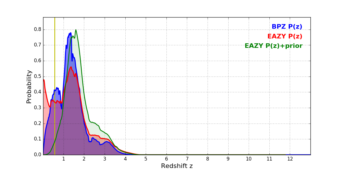 In P(z) plots: Yellow lines mark the cluster redshift z = 0.566,