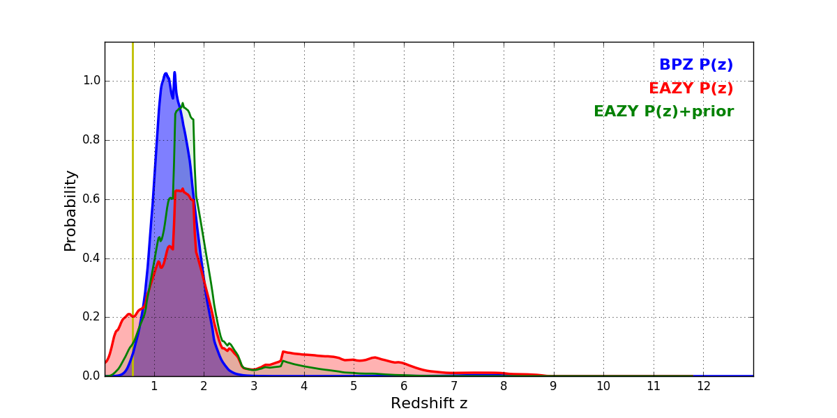 In P(z) plots: Yellow lines mark the cluster redshift z = 0.566,