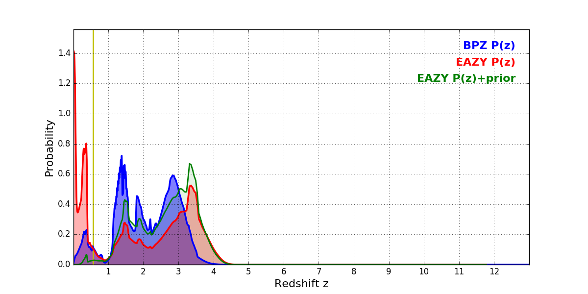 In P(z) plots: Yellow lines mark the cluster redshift z = 0.566,