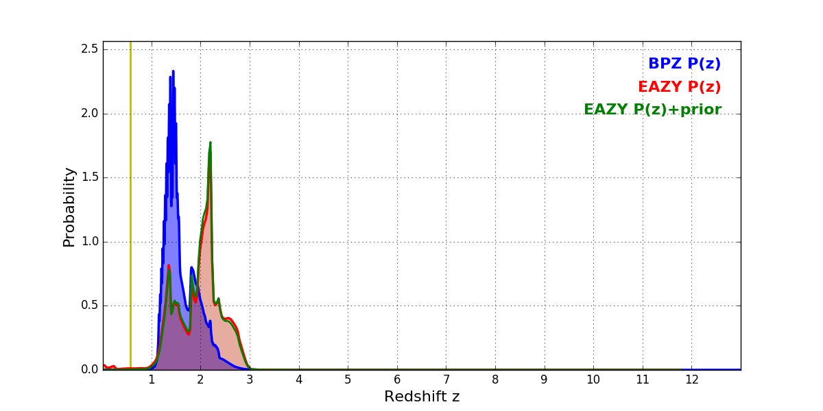 In P(z) plots: Yellow lines mark the cluster redshift z = 0.566,