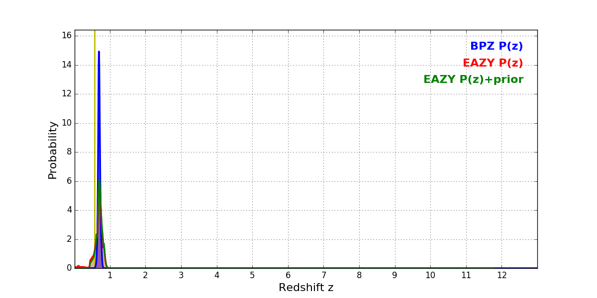 In P(z) plots: Yellow lines mark the cluster redshift z = 0.566,