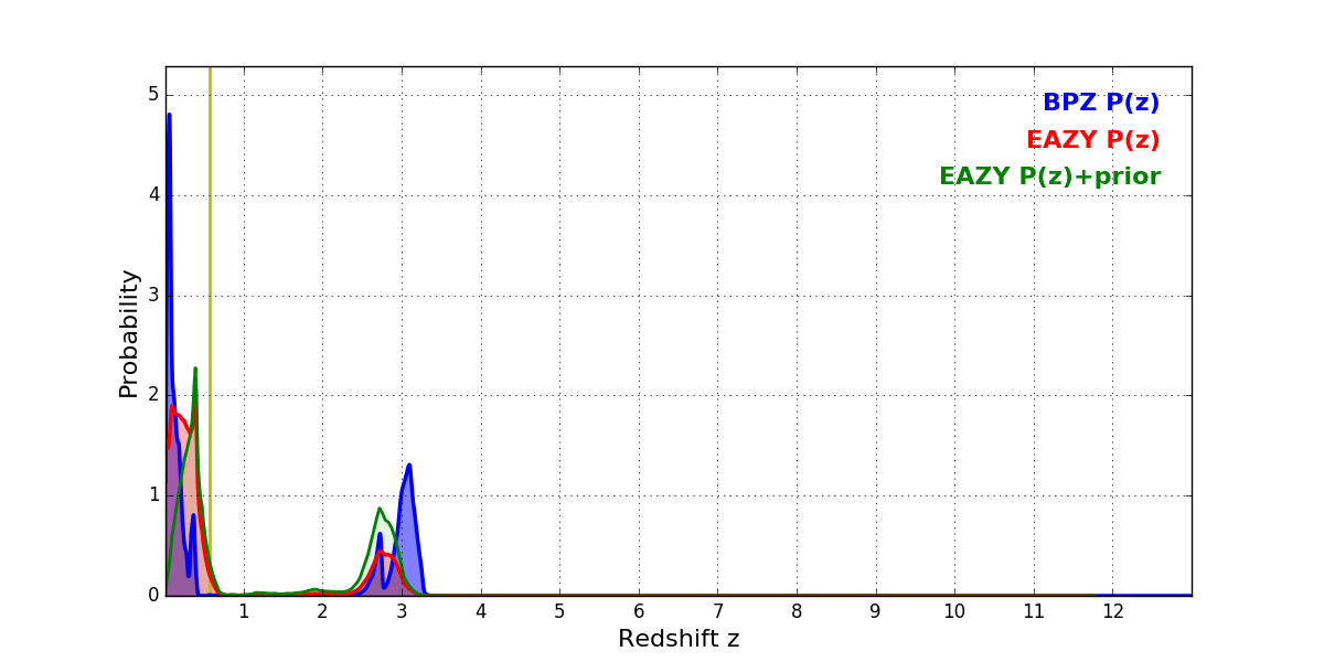 In P(z) plots: Yellow lines mark the cluster redshift z = 0.566,