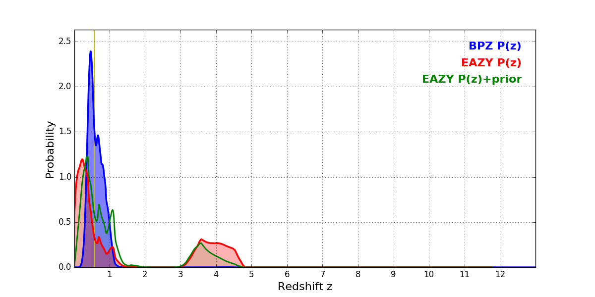 In P(z) plots: Yellow lines mark the cluster redshift z = 0.566,