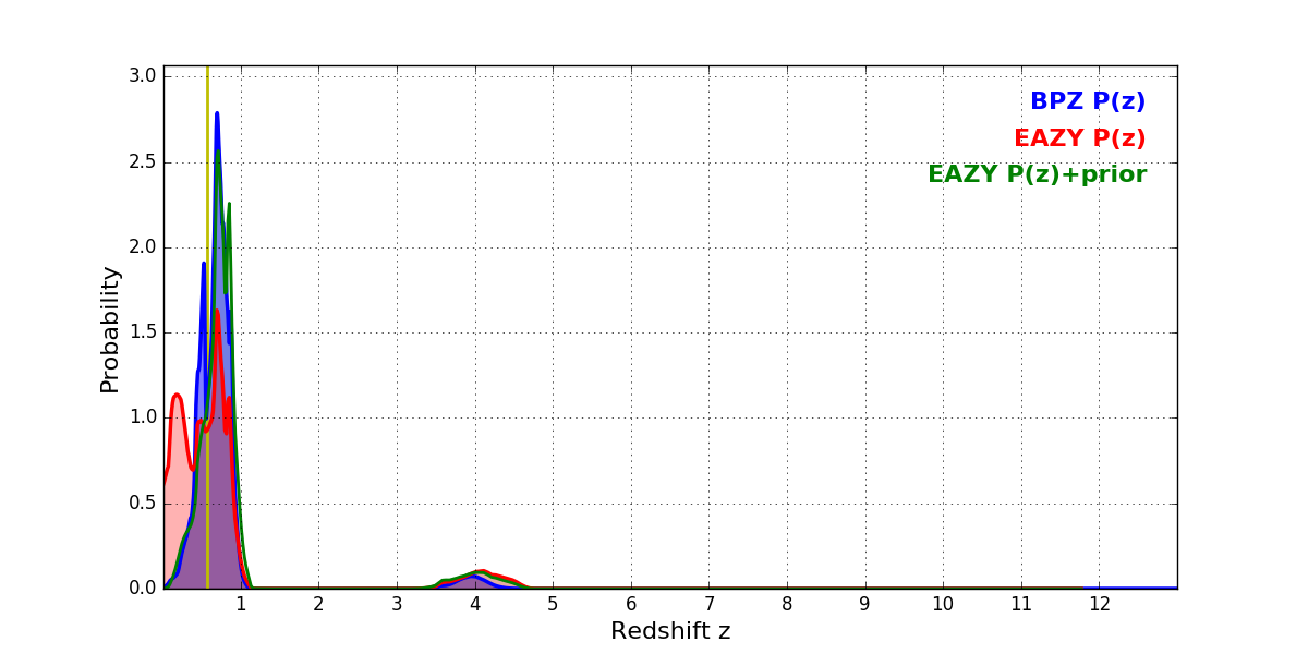 In P(z) plots: Yellow lines mark the cluster redshift z = 0.566,