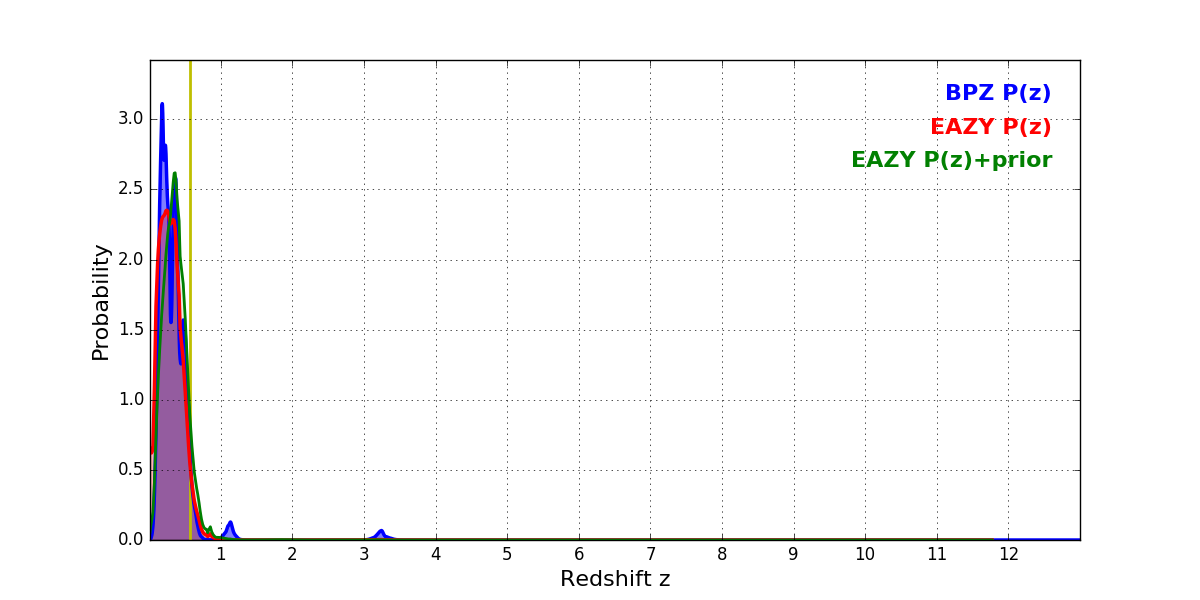 In P(z) plots: Yellow lines mark the cluster redshift z = 0.566,