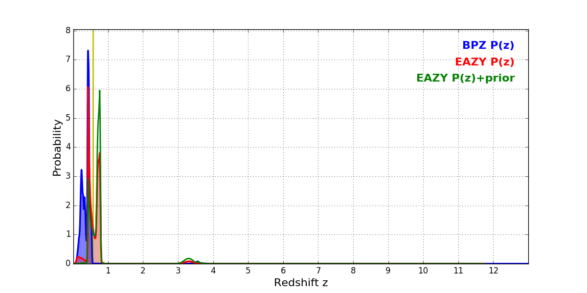 In P(z) plots: Yellow lines mark the cluster redshift z = 0.566,
