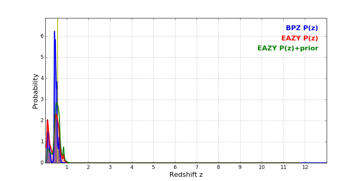 In P(z) plots: Yellow lines mark the cluster redshift z = 0.566,