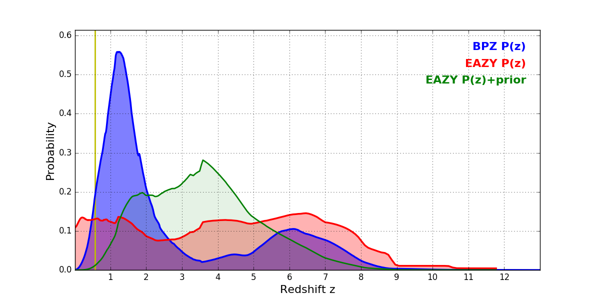 In P(z) plots: Yellow lines mark the cluster redshift z = 0.566,