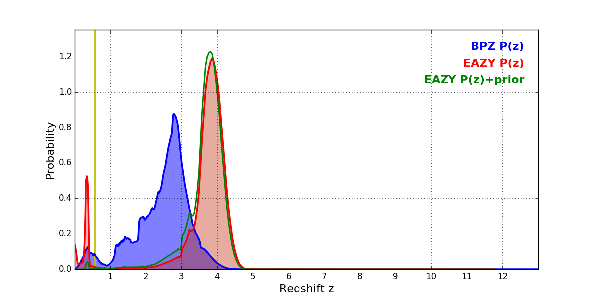 In P(z) plots: Yellow lines mark the cluster redshift z = 0.566,