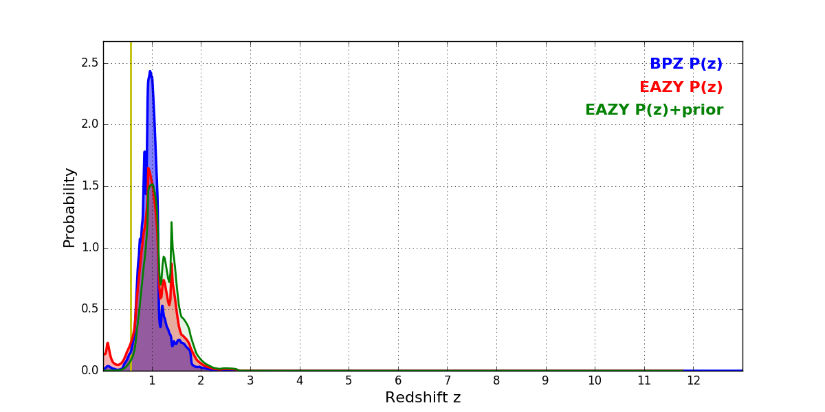 In P(z) plots: Yellow lines mark the cluster redshift z = 0.566,