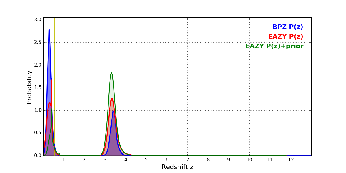 In P(z) plots: Yellow lines mark the cluster redshift z = 0.566,