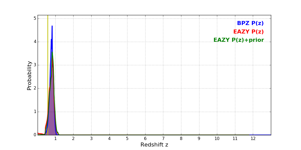 In P(z) plots: Yellow lines mark the cluster redshift z = 0.566,