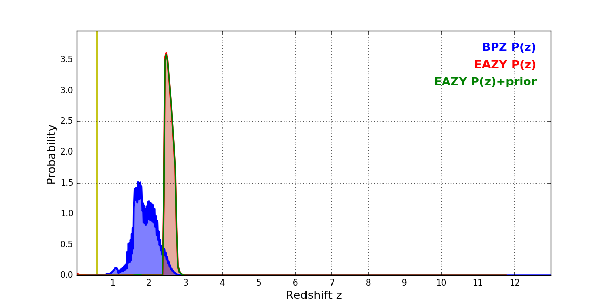 In P(z) plots: Yellow lines mark the cluster redshift z = 0.566,