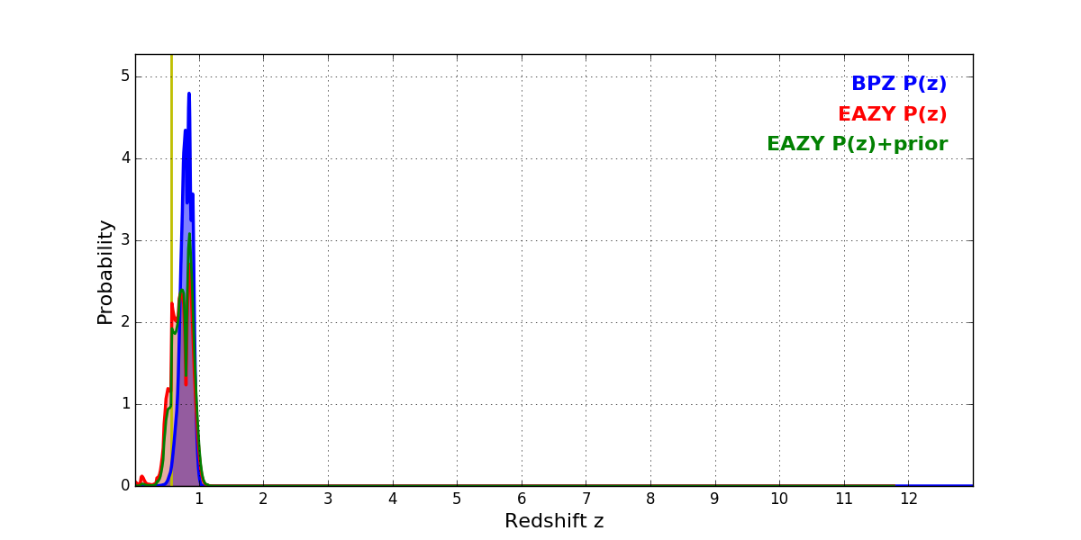 In P(z) plots: Yellow lines mark the cluster redshift z = 0.566,