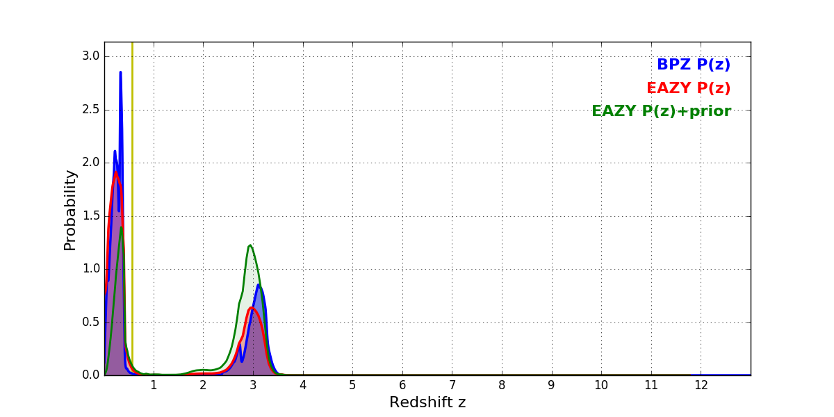In P(z) plots: Yellow lines mark the cluster redshift z = 0.566,