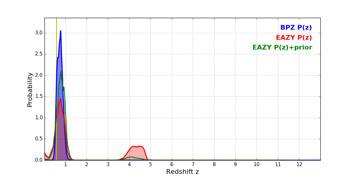 In P(z) plots: Yellow lines mark the cluster redshift z = 0.566,