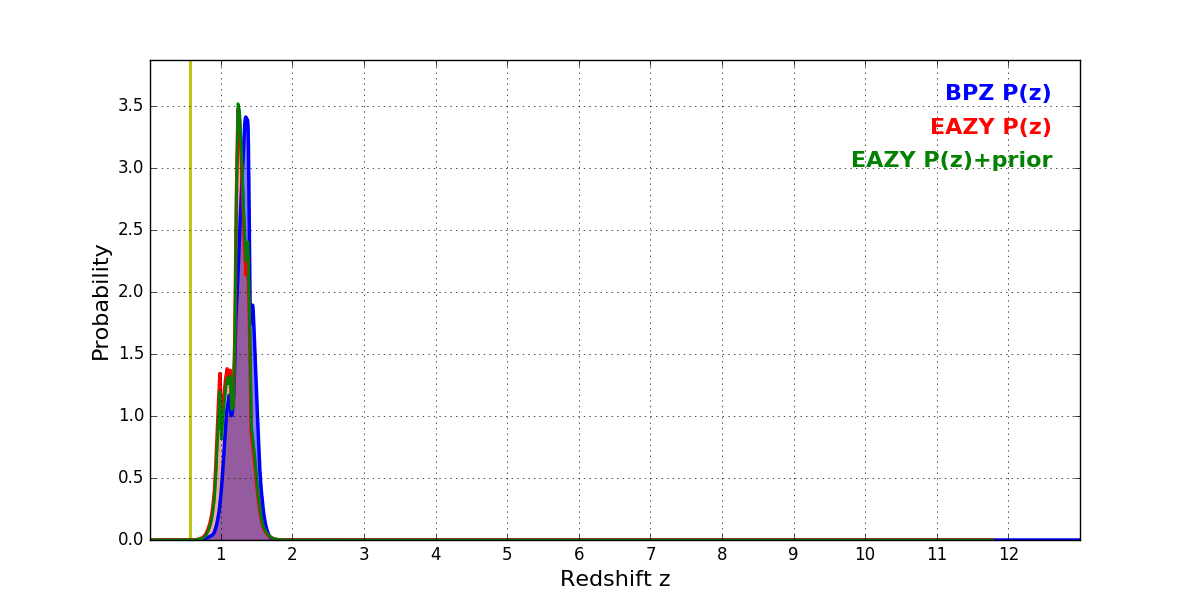 In P(z) plots: Yellow lines mark the cluster redshift z = 0.566,