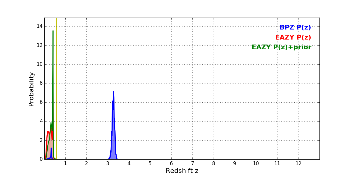 In P(z) plots: Yellow lines mark the cluster redshift z = 0.566,