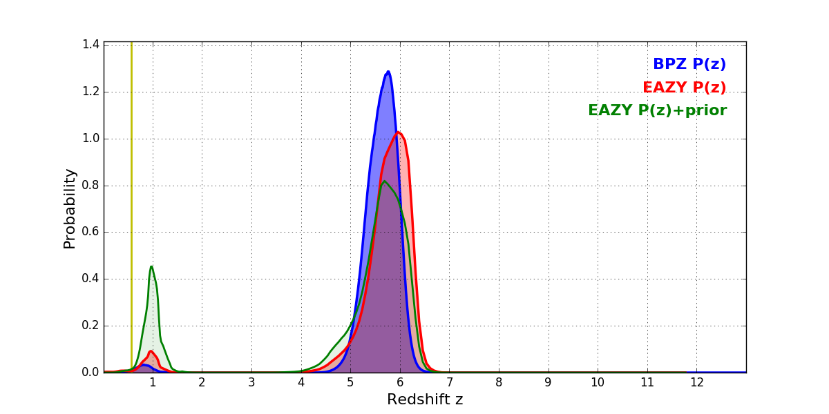 In P(z) plots: Yellow lines mark the cluster redshift z = 0.566,