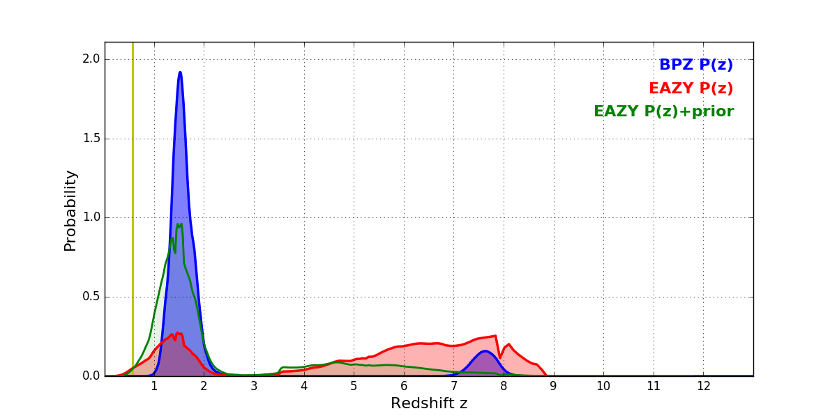 In P(z) plots: Yellow lines mark the cluster redshift z = 0.566,