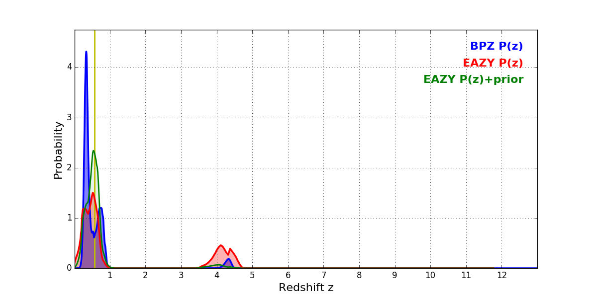 In P(z) plots: Yellow lines mark the cluster redshift z = 0.566,
