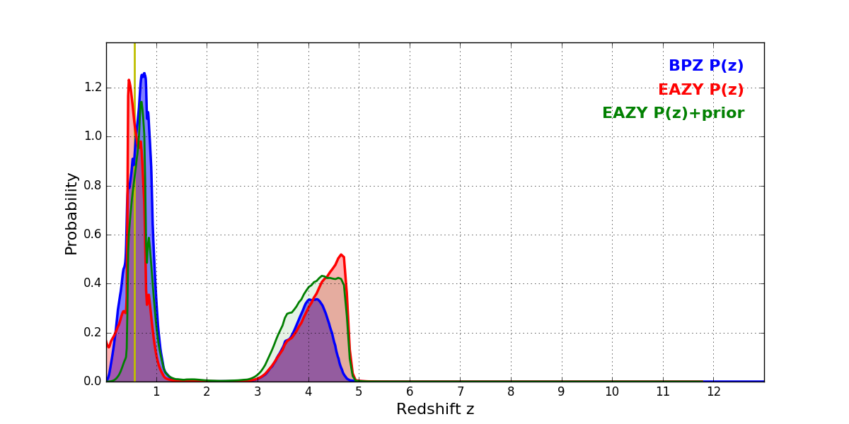 In P(z) plots: Yellow lines mark the cluster redshift z = 0.566,
