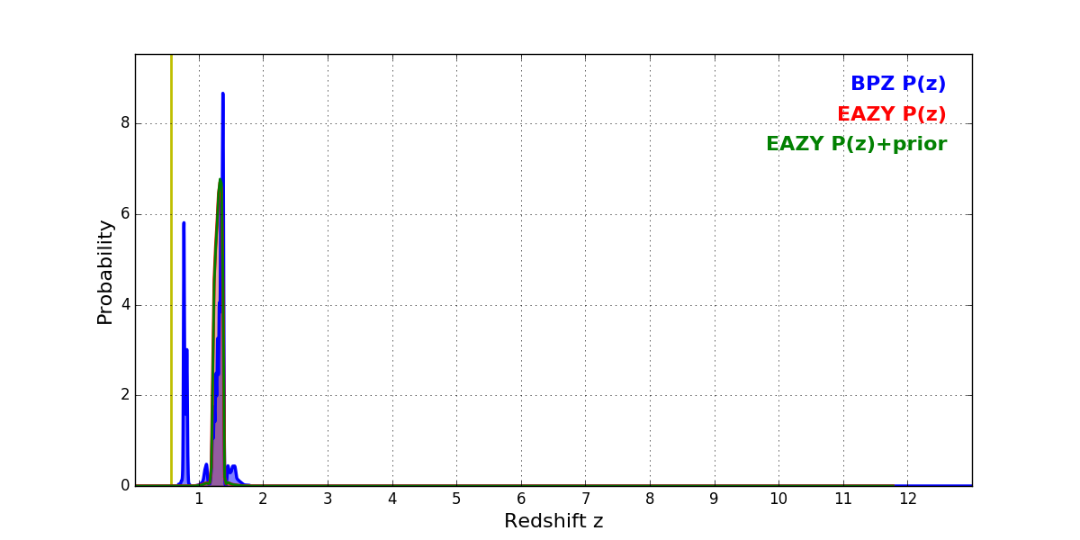 In P(z) plots: Yellow lines mark the cluster redshift z = 0.566,