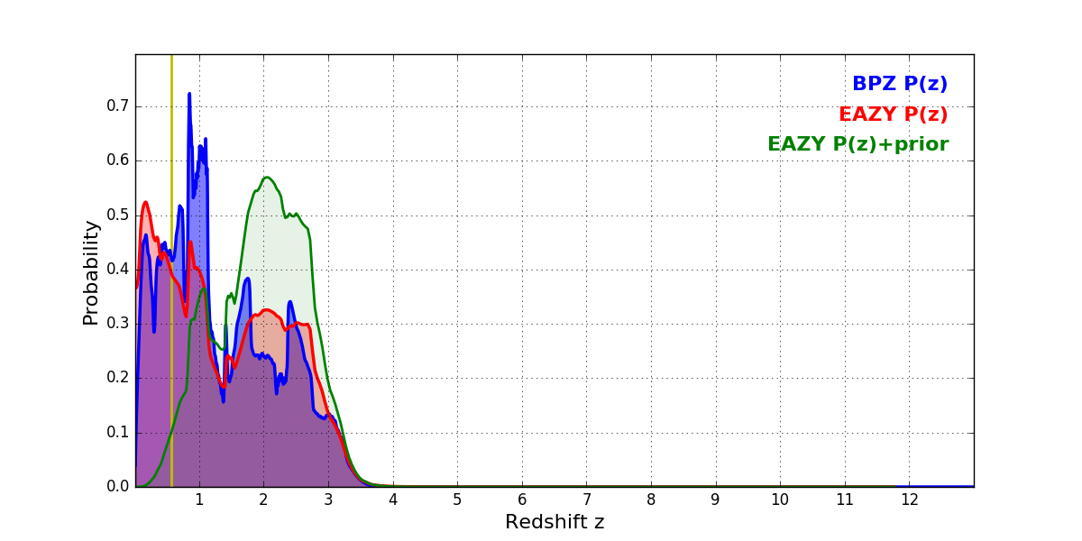 In P(z) plots: Yellow lines mark the cluster redshift z = 0.566,