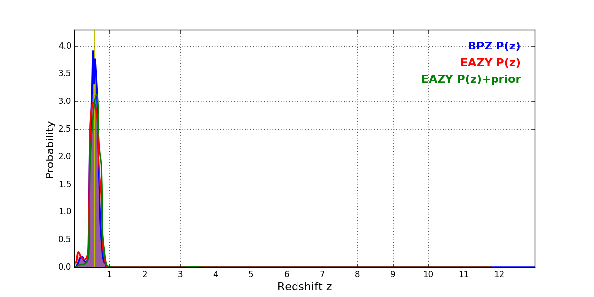 In P(z) plots: Yellow lines mark the cluster redshift z = 0.566,