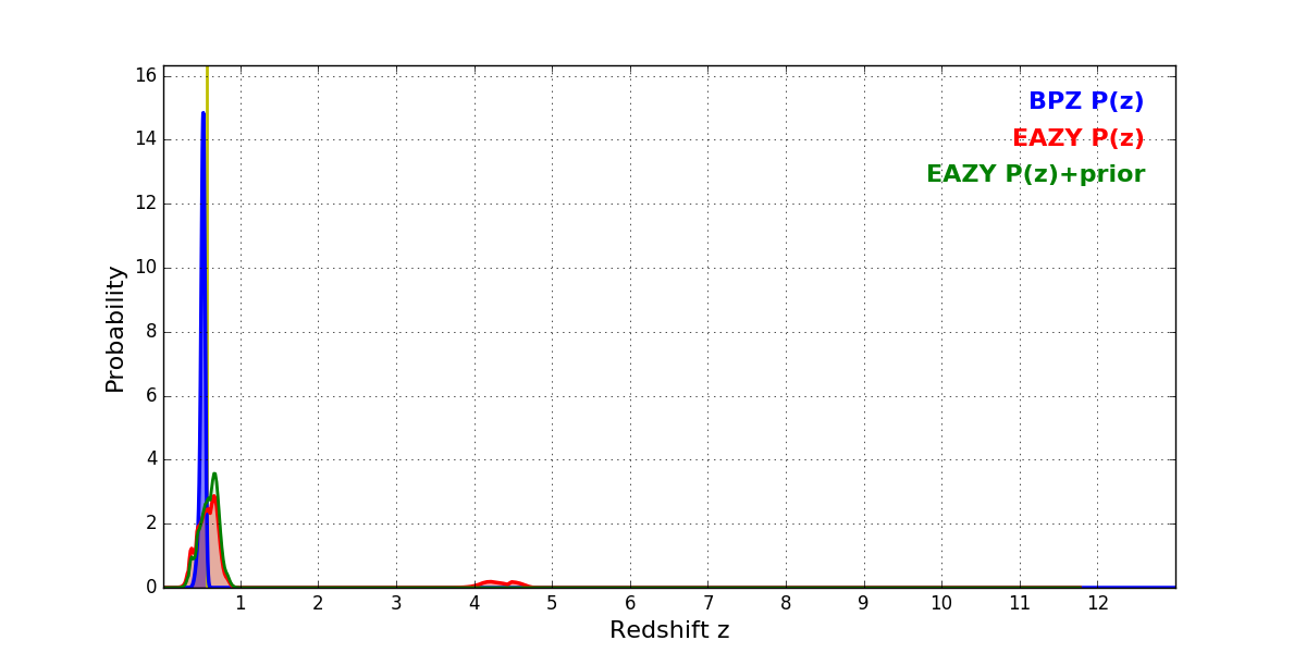 In P(z) plots: Yellow lines mark the cluster redshift z = 0.566,