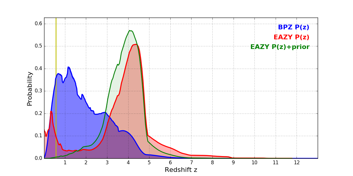 In P(z) plots: Yellow lines mark the cluster redshift z = 0.566,
