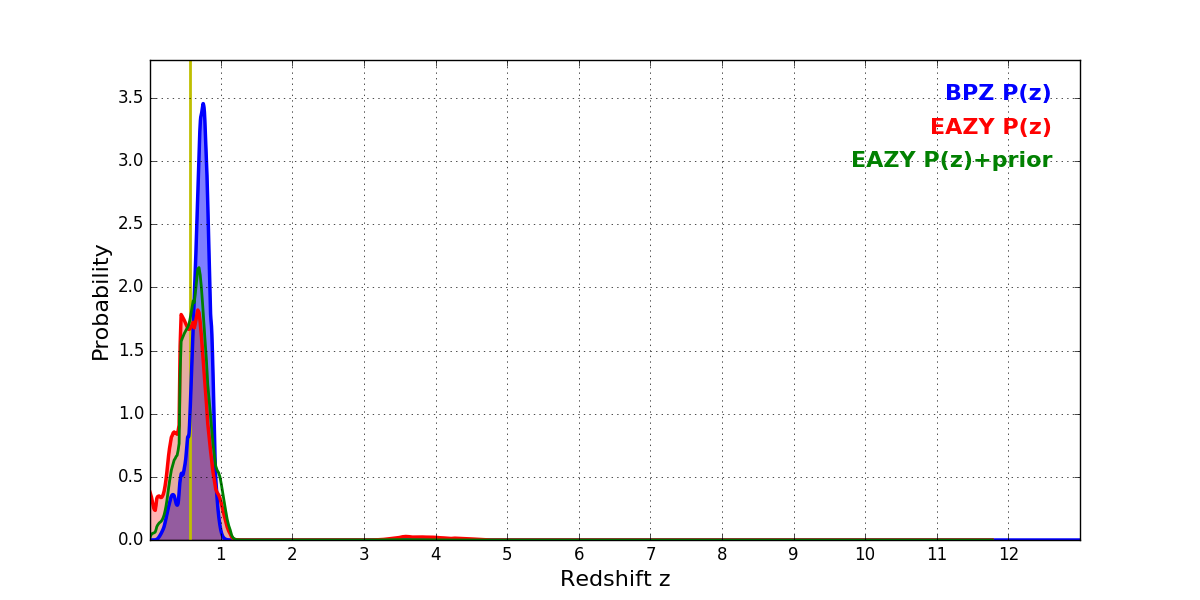 In P(z) plots: Yellow lines mark the cluster redshift z = 0.566,
