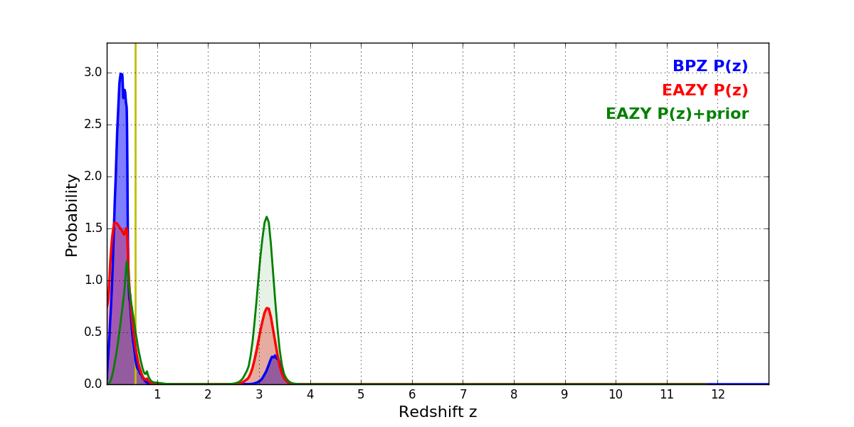 In P(z) plots: Yellow lines mark the cluster redshift z = 0.566,