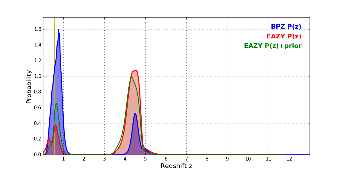 In P(z) plots: Yellow lines mark the cluster redshift z = 0.566,