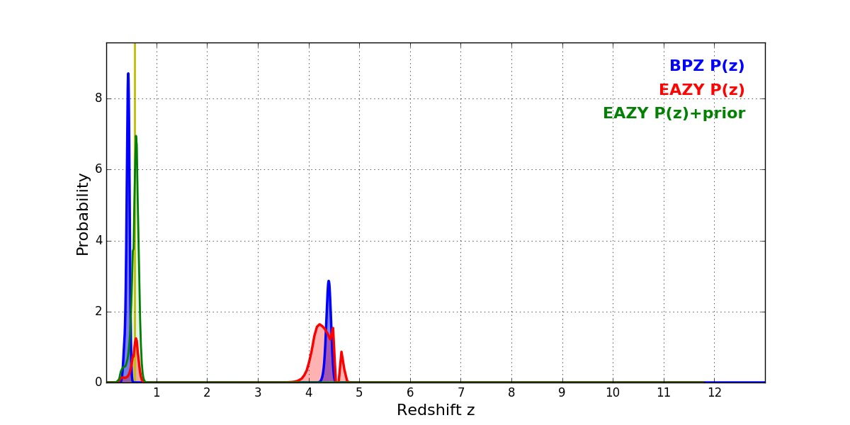 In P(z) plots: Yellow lines mark the cluster redshift z = 0.566,