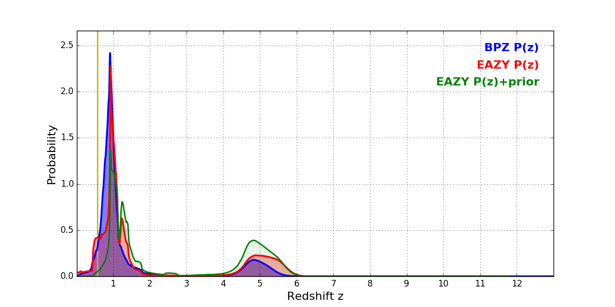 In P(z) plots: Yellow lines mark the cluster redshift z = 0.566,