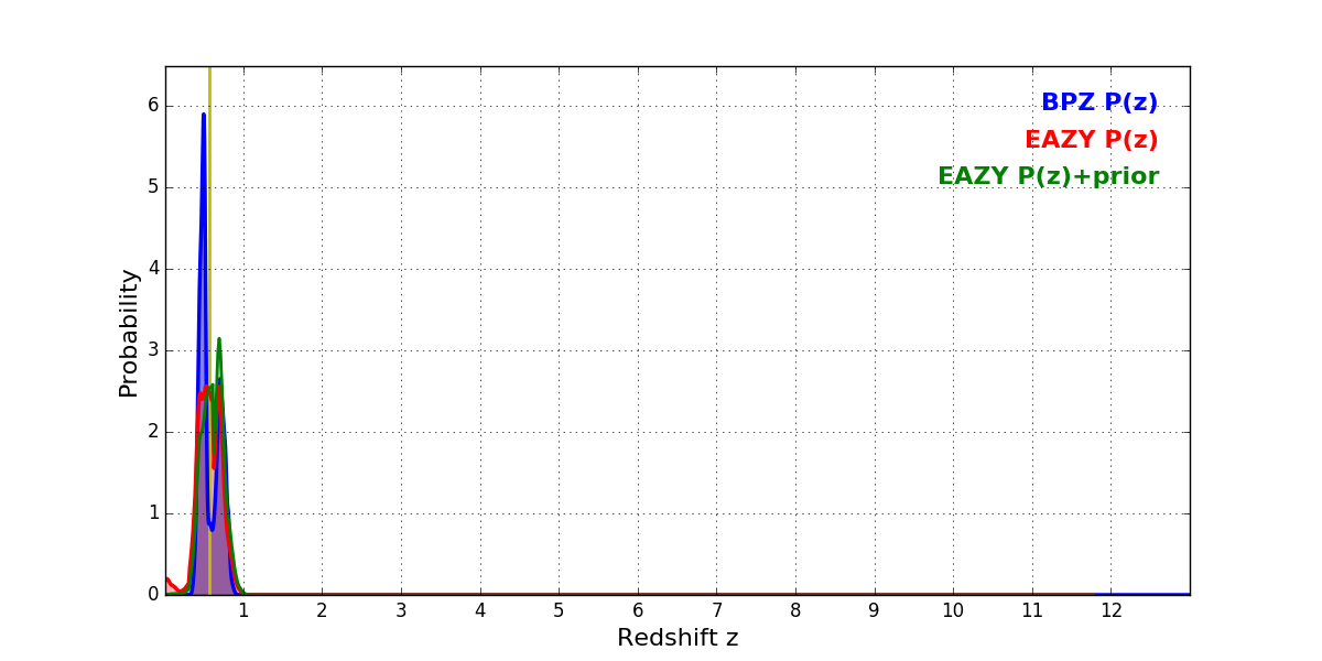In P(z) plots: Yellow lines mark the cluster redshift z = 0.566,