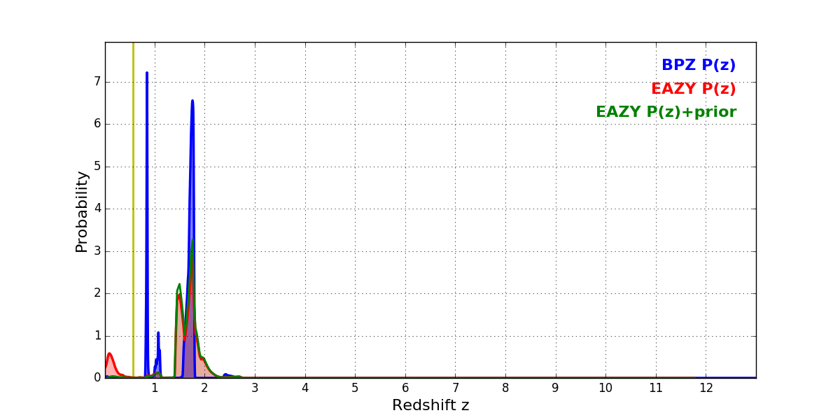 In P(z) plots: Yellow lines mark the cluster redshift z = 0.566,