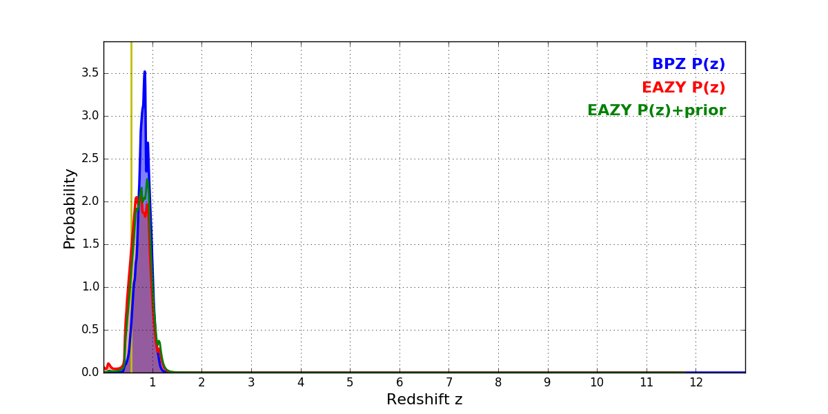 In P(z) plots: Yellow lines mark the cluster redshift z = 0.566,