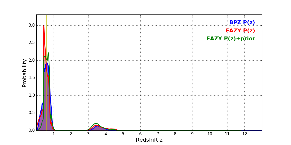 In P(z) plots: Yellow lines mark the cluster redshift z = 0.566,