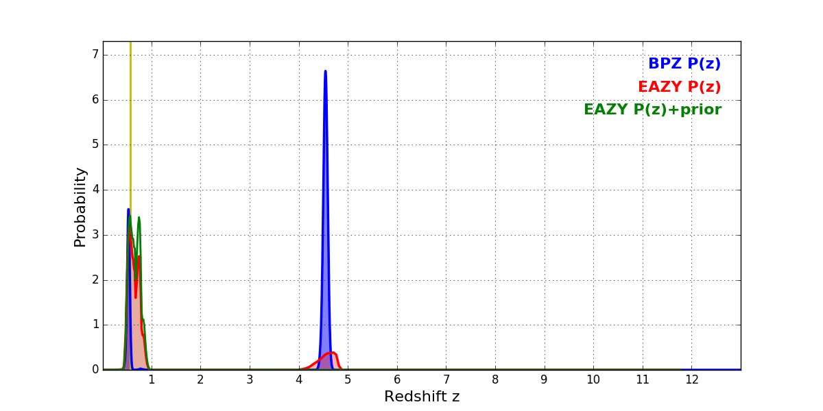 In P(z) plots: Yellow lines mark the cluster redshift z = 0.566,