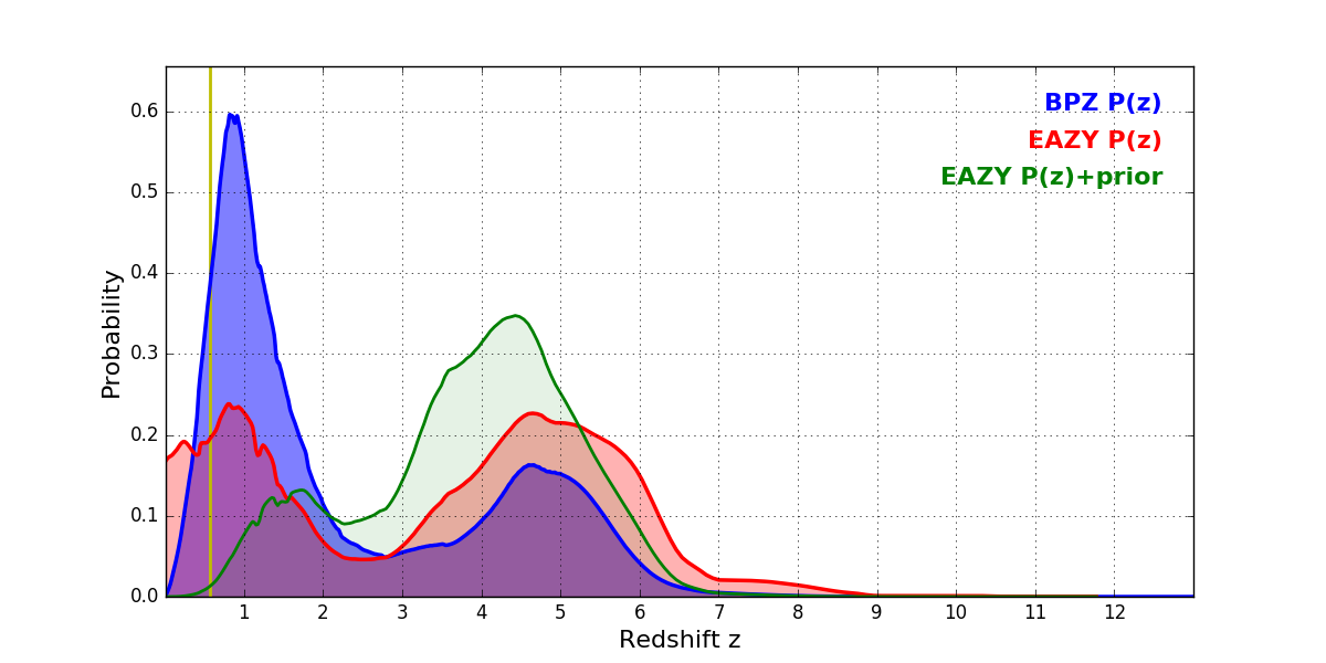 In P(z) plots: Yellow lines mark the cluster redshift z = 0.566,
