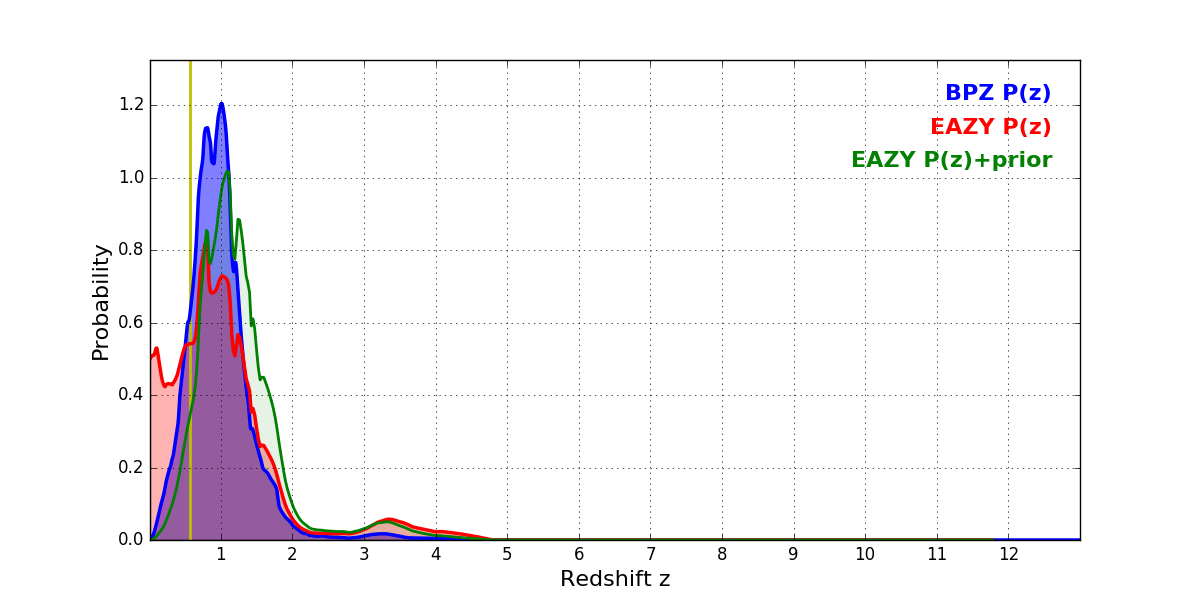 In P(z) plots: Yellow lines mark the cluster redshift z = 0.566,