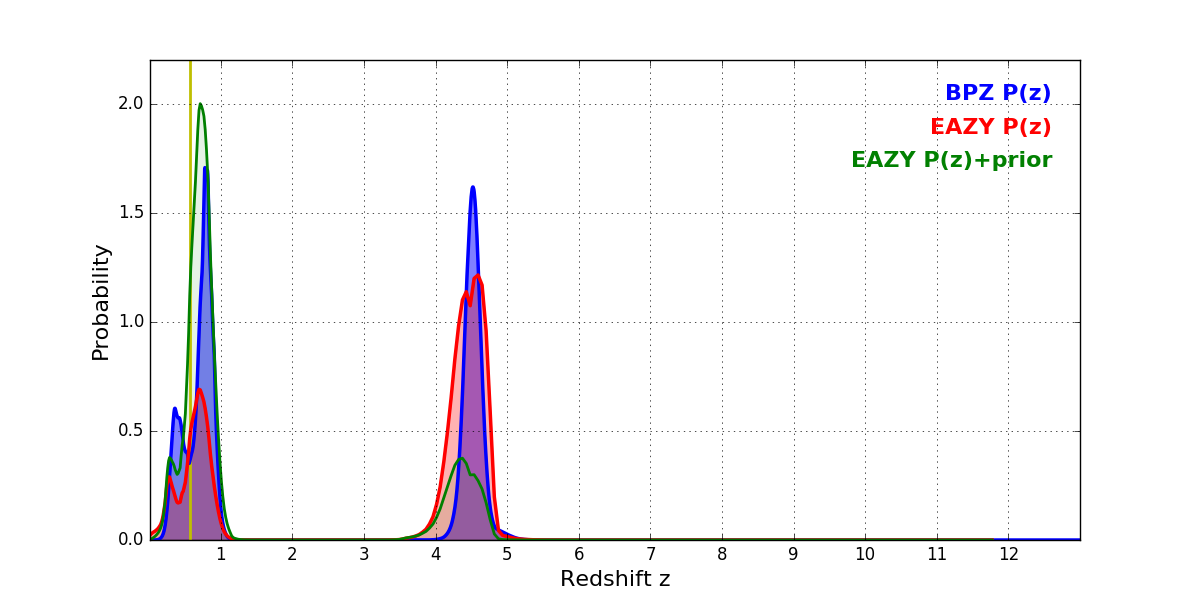 In P(z) plots: Yellow lines mark the cluster redshift z = 0.566,