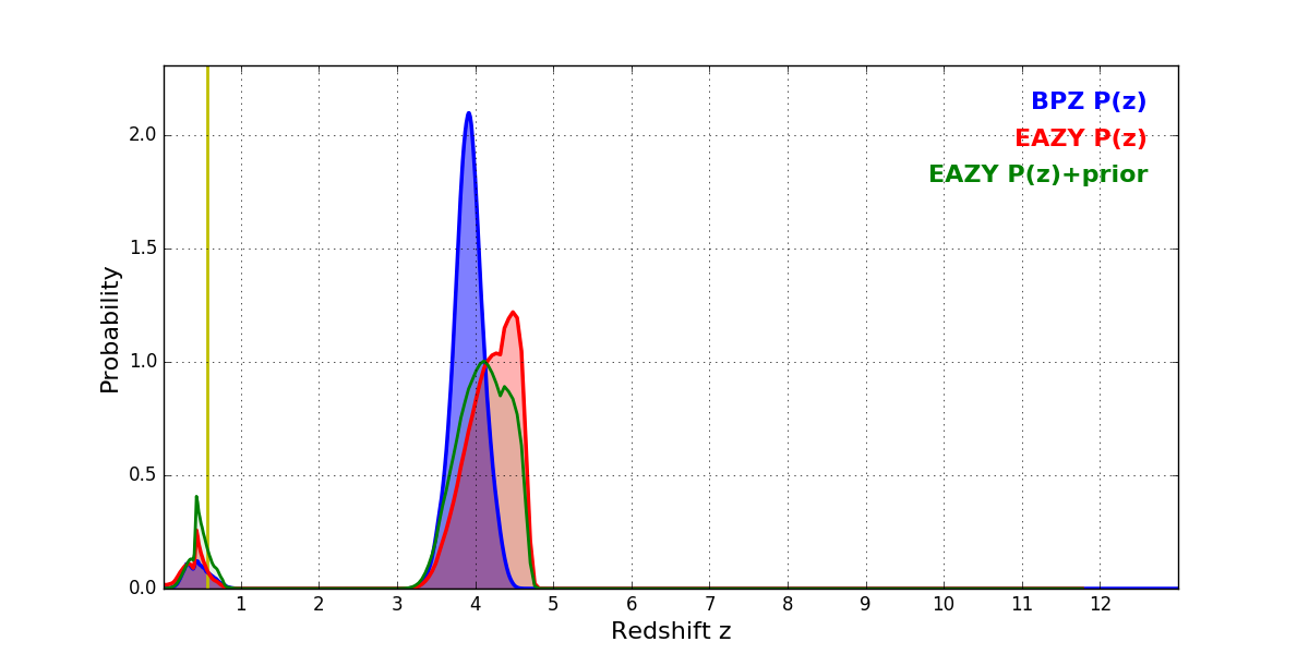 In P(z) plots: Yellow lines mark the cluster redshift z = 0.566,