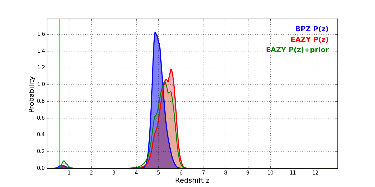 In P(z) plots: Yellow lines mark the cluster redshift z = 0.566,