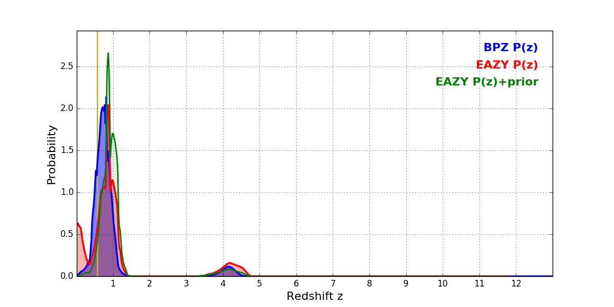 In P(z) plots: Yellow lines mark the cluster redshift z = 0.566,